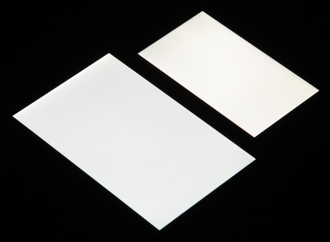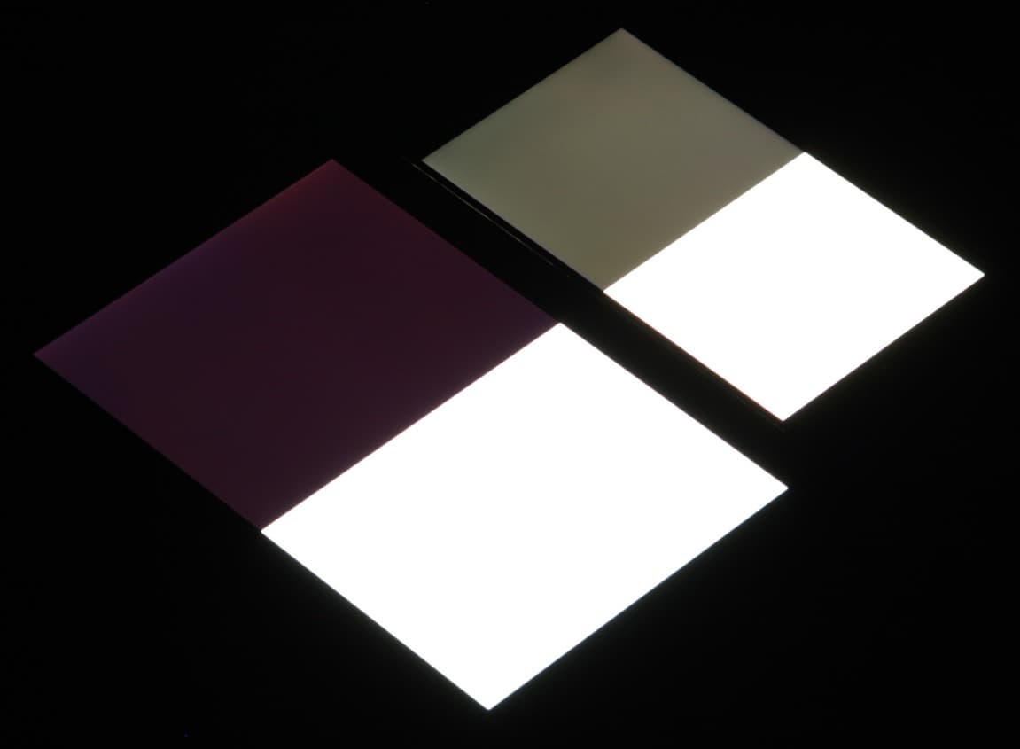 Отметим некоторую неравномерность яркости и цветового тона белого поля.