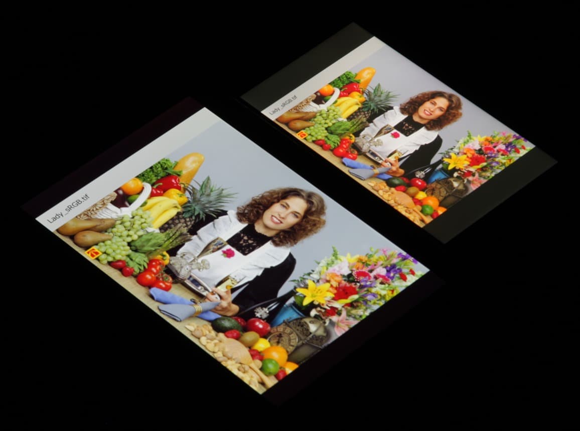 Такое мы уже видели в случае, например, Sony Xperia Z2 и других мобильных устройств. Sony указывает, что в этих экранах используются светодиоды с синим излучателем и зеленым и красным люминофором (обычно — синий излучатель и желтый люминофор), что в сочетании со специальными светофильтрами матрицы и позволяет получить широкий цветовой охват. Да, и в красном люминофоре, видимо, используются так называемые квантовые точки. Для потребительского устройства широкий цветовой охват является никак не достоинством, а существенным недостатком, поскольку в итоге цвета изображений — рисунков, фотографий и фильмов, — ориентированных на пространство sRGB (а таких подавляющее большинство), имеют неестественную насыщенность. Особенно это заметно на узнаваемых оттенках, например на оттенках кожи. Результат приведен на фотографии выше.
