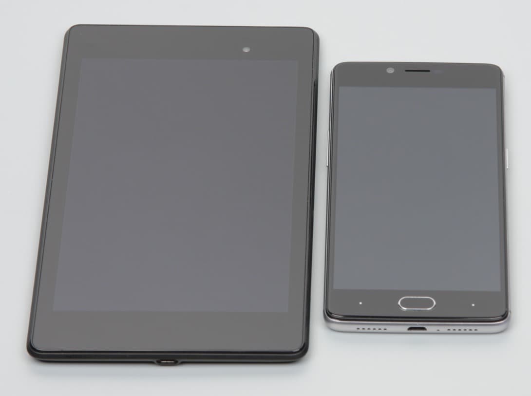 Лицевая поверхность экрана выполнена в виде стеклянной пластины с зеркально-гладкой поверхностью, устойчивой к появлению царапин. Судя по отражению объектов антибликовые свойства экрана чуть хуже, чем у экрана Google Nexus 7 (2013) (далее просто Nexus 7). Для наглядности приведем фотографию, на которой в выключенных экранах отражается белая поверхность (слева — Nexus 7, справа — Doogee Shoot 1, далее их можно различать по размеру):