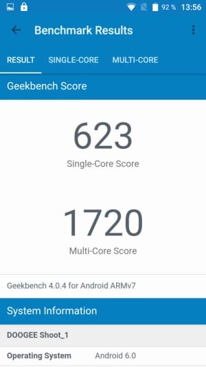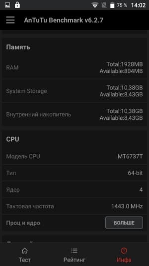 Стоит заметить, что здесь используется чуть более мощная, разогнанная модификация платформы MediaTek MT6737Т, у нее максимальная частота процессорных ядер увеличена до 1,44 ГГц (у обычной — 1,25 ГГц). И тем не менее, платформа в любом случае довольно слабенькая, ориентирована она на ультрабюджетный класс устройств. Ждать от такой SoC высоких показателей производительности, естественно, не стоит, и все тесты это доказывают.