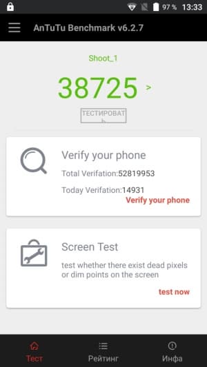 Из-за разогнанной модификации чипа с увеличенной частотой процессорных ядер смартфон в тестах показывает не настолько уж низкий уровень, но все-таки явно ниже среднего. На минимальных настройках пока идут все игры, но требовательные, такие как Dead Trigger 2 или Modern Combat 5, местами заметно притормаживают. В целом производительности для основных нужд пока хватает, но это не мультимедийное решение, да и запаса мощности на будущее тут нет.