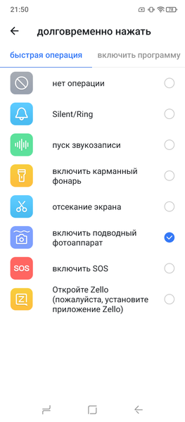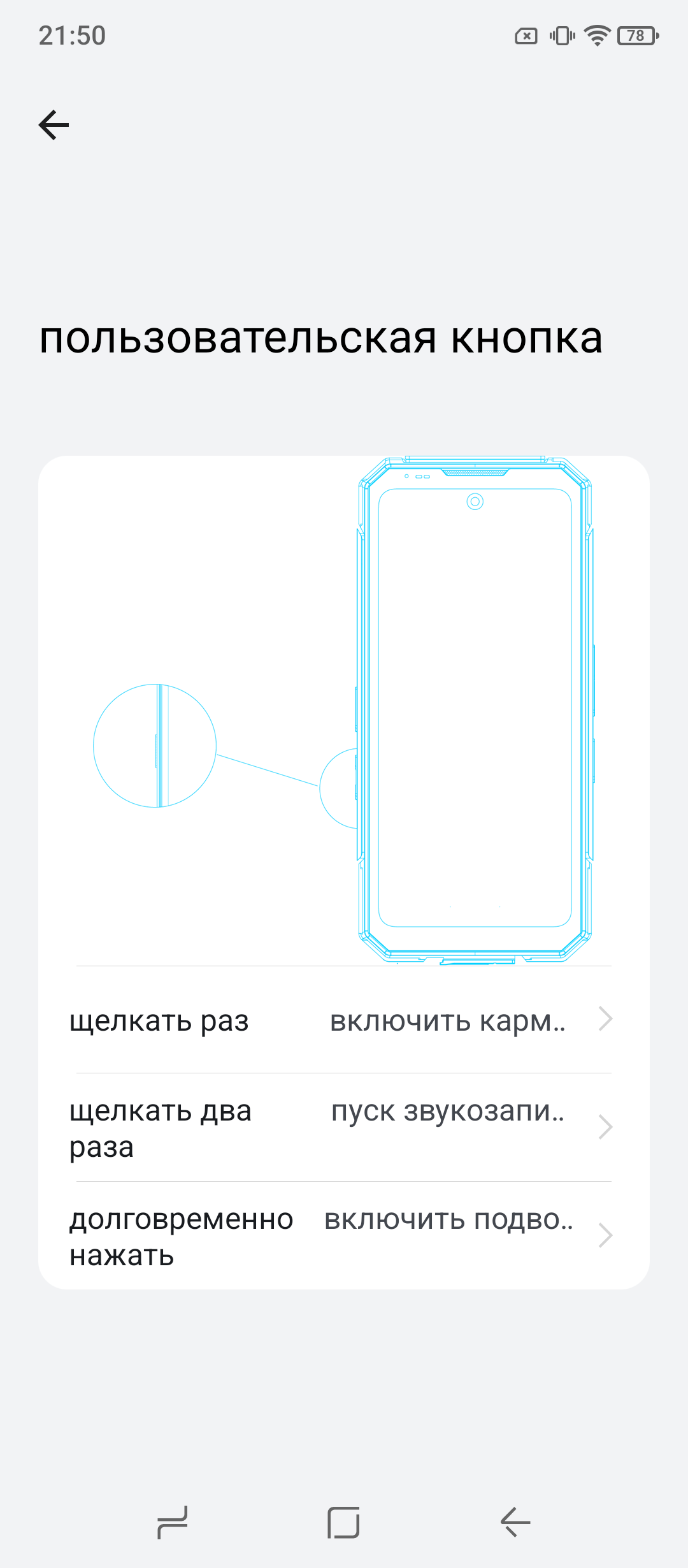 Упомянутая отдельная программируемая кнопка реализует через одиночное/двойное нажатие или долгое удержание различные заведенные на эти действия функции. Их можно выбрать самому в разделе настроек меню. Не всегда благозвучно, но хотя бы переведенного на русский язык, пусть и машинным переводом.