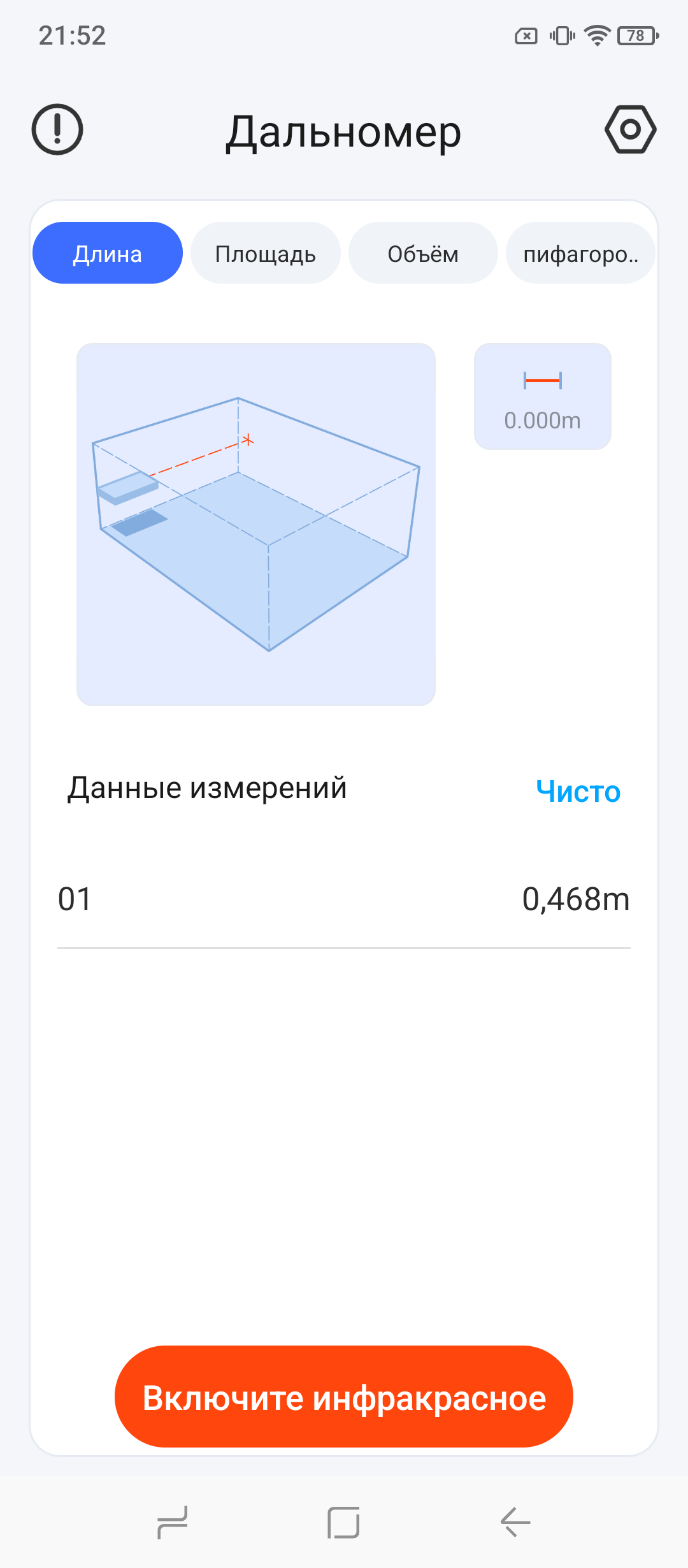Еще одна дополнительная кнопка на боку вызывают встроенный лазерный дальномер. С его помощью можно измерить длину, площадь или объем. Работает в диапазоне 0,08‒40 м с точностью ±3‒15 мм и разрешением 1 мм, позволяя планировать пространство в метрах, футах или дюймах.