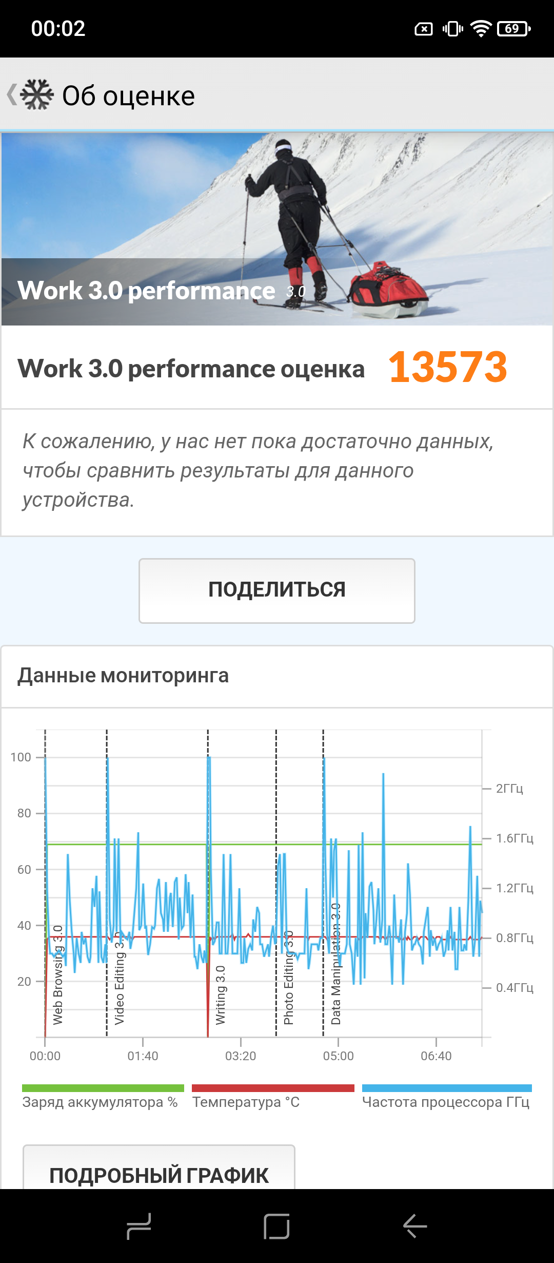 Тест на снижение производительности при нагреве мы проводим с помощью программы Burnout Benchmark, которая позволяет нагружать CPU, GPU и NPU. Уровень тротлинга при нагрузке на GPU (то бишь в играх) невысокий.