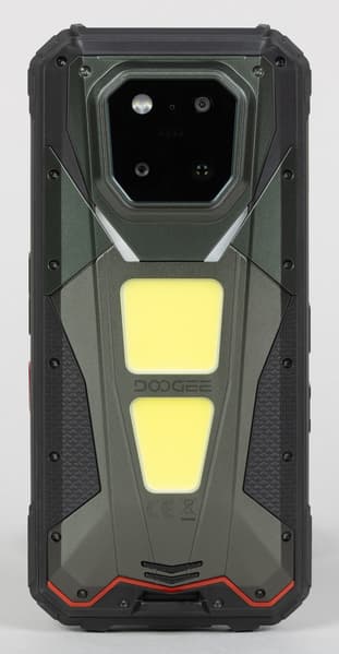 Кстати о фонаре. Помимо привычной светодиодной вспышки рядом с камерами, у данной модели имеется еще настоящий кемпинговый фонарь. Он выглядит как два желтых сегмента, сходящихся на конус на задней стенке. Если фонарь должным образом установить, он будет действительно освещать в ночи площадку перед палаткой для организационных нужд. Светит очень ярко (1200 люмен).