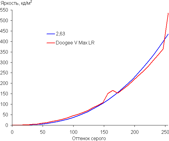 Построенная по 32 точкам с равным интервалом по численному значению оттенка серого гамма-кривая не выявила завала ни в светах, ни в тенях. Показатель аппроксимирующей степенной функции равен 2,63, что выше стандартного значения 2,2. При этом реальная гамма-кривая существенно отклоняется от степенной зависимости: