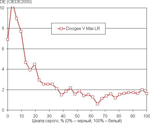 При этом цветовая температура и ΔE мало изменяются от оттенка к оттенку — это положительно сказывается на визуальной оценке цветового баланса. (Самые темные области шкалы серого можно не учитывать, так как там баланс цветов не имеет большого значения, да и погрешность измерений цветовых характеристик на низкой яркости большая.)