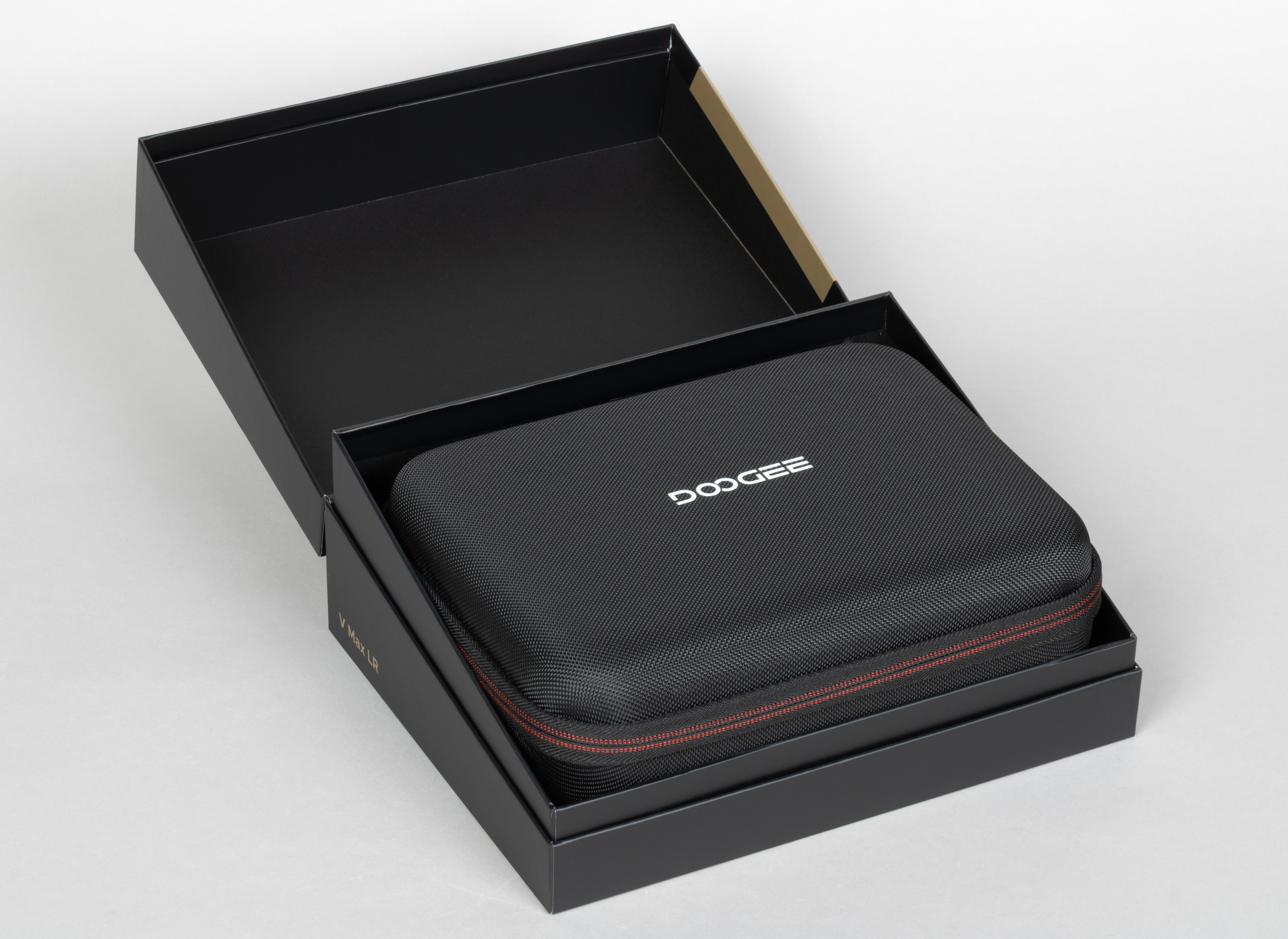 Смартфон Doogee V Max LR поставляется в большой картонной коробке в форме шкатулки с откидывающейся крышкой.