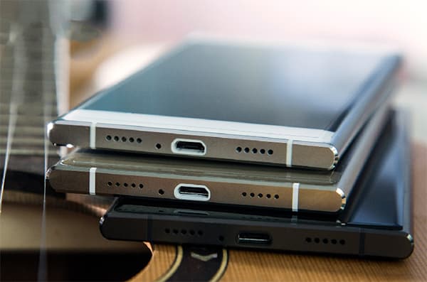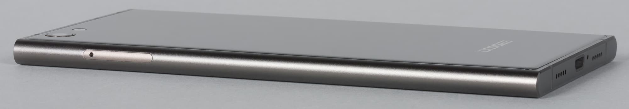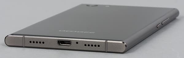 Основной динамик выведен в нижний торец, звук выходит через набор мелких отверстий, причем симметрично расположенная решетка является бутафорией. Для разговорного динамика стандартно прорезано отверстие в переднем стекле. На нижнем торце можно найти и разъем Micro-USB, который поддерживает не только подключение внешних устройств в режиме USB OTG, но и их зарядку. То есть от Doogee Y300 можно через соответствующий переходник заряжать, например, другой смартфон.