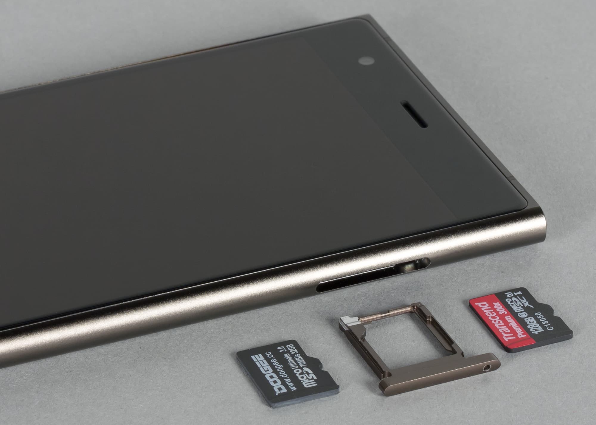 Сменных деталей на корпусе Doogee Y300 нет, батарея несъемная, карточки вставляются в выдвижной боковой разъем. Гибридный слот может принять карту Micro-SIM и карту памяти microSD либо вторую SIM-карту, уже формата Nano-SIM, вместо карты памяти. Три карточки одновременно вставить нельзя. Салазки двусторонние: карточки накладываются на металлическую ферму с одной и с другой стороны, их обе необходимо придерживать при установке в разъем. Поддерживается горячая замена карт, вручную перезагружать аппарат не требуется.