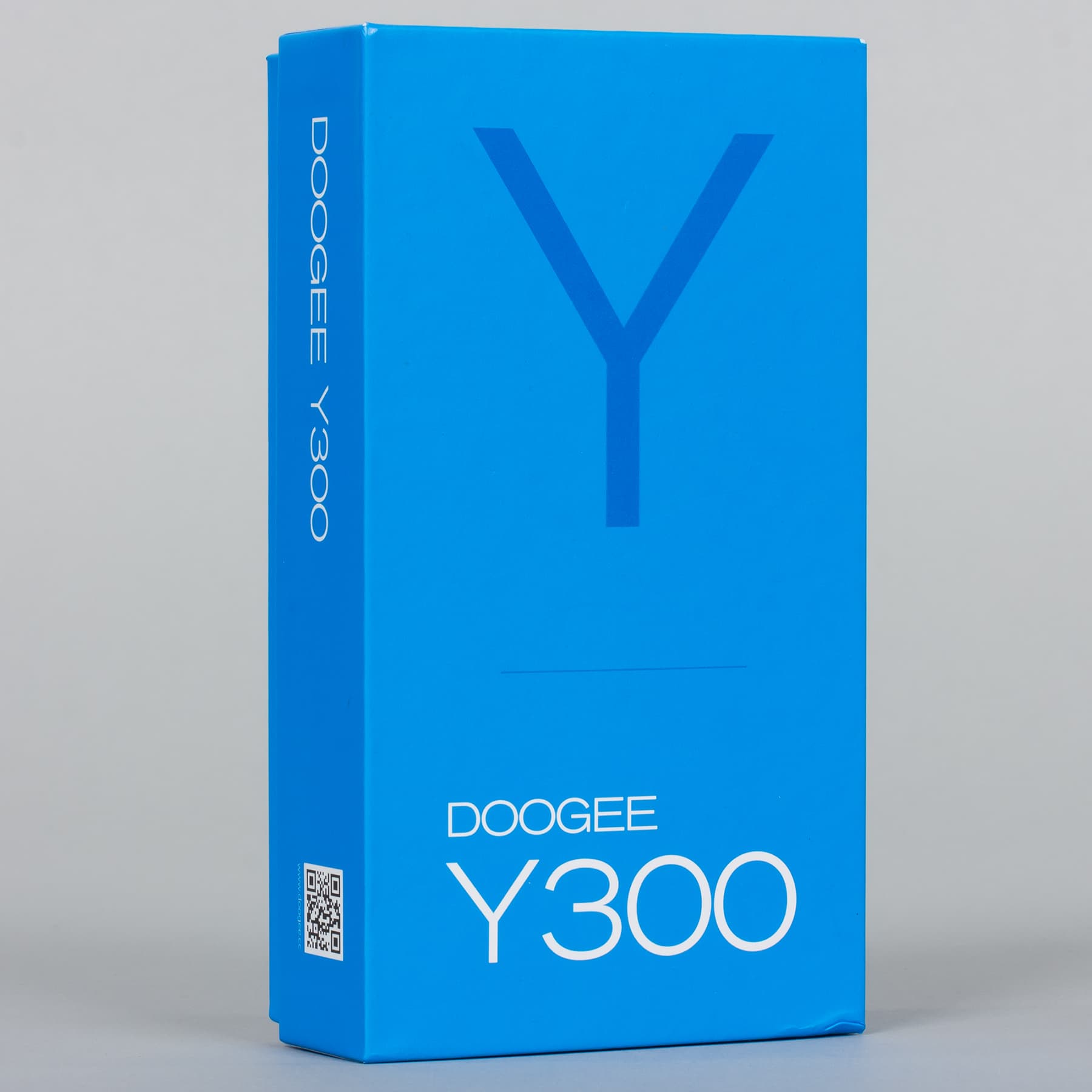Doogee Y300 поставляется в небольшой по размеру, но довольно вместительной прямоугольной коробочке из твердого матового картона. Коробка выполнена и оформлена, на удивление, аккуратно и качественно. Удачное сочетание синего фона и белых надписей, отсутствие разноцветия и картинок, минимальное количество информации создают благоприятное впечатление при первом знакомстве с продуктом.