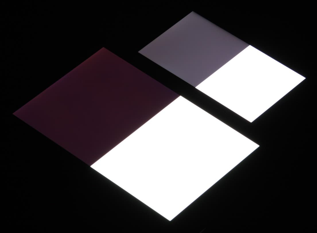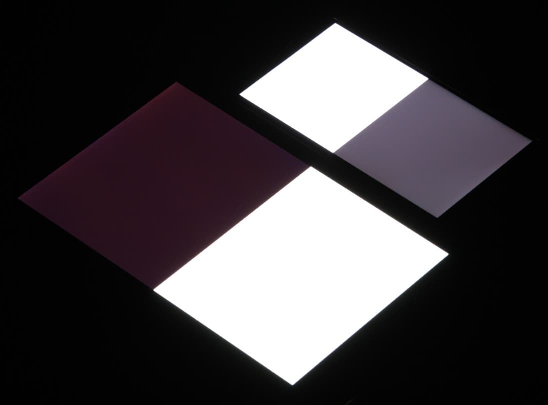 Яркость под углом у экранов уменьшилась (как минимум в 5 раз, исходя из разницы в выдержке), но в случае Doogee Y300 падение яркости больше. Черное поле при отклонении по диагонали высветляется сильно и приобретает фиолетовый оттенок. Фотографии ниже это демонстрируют (яркость белых участков в перпендикулярном плоскости экранов направлении одинаковая!):