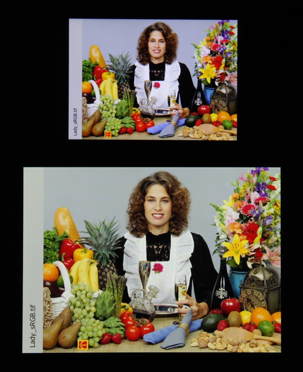 В итоге цвета имеют естественную насыщенность. Баланс оттенков на шкале серого средний, так как цветовая температура существенно выше стандартных 6500 К, правда, отклонение от спектра абсолютно черного тела (ΔE) ниже 10, что для потребительского устройства считается приемлемым показателем. При этом цветовая температура и ΔE мало изменяются от оттенка к оттенку — это положительно сказывается на визуальной оценке цветового баланса. (Самые темные области шкалы серого можно не учитывать, так как там баланс цветов не имеет большого значения, да и погрешность измерений цветовых характеристик на низкой яркости большая.)