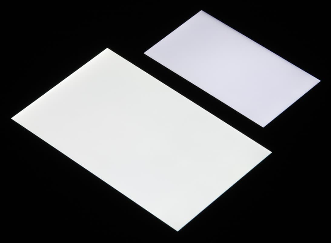 При перпендикулярном взгляде равномерность черного поля плохая, также впечатление портит то, что свет от светодиодов подсветки просвечивает сквозь щели по длинным краям экрана: