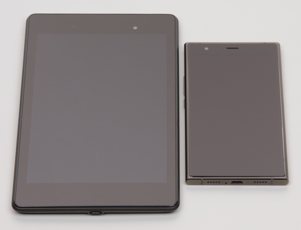 Лицевая поверхность экрана выполнена в виде стеклянной пластины с зеркально-гладкой поверхностью, устойчивой к появлению царапин. Судя по отражению объектов антибликовые свойства экрана лучше, чем у экрана Google Nexus 7 (2013) (далее просто Nexus 7). Для наглядности приведем фотографию, на которой в выключенных экранах отражается белая поверхность (слева — Nexus 7, справа — Doogee Y300, далее их можно различать по размеру):