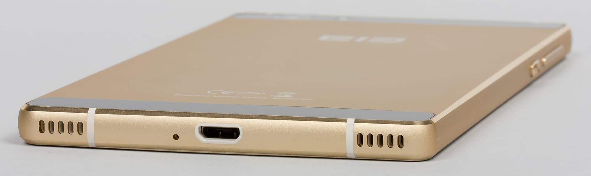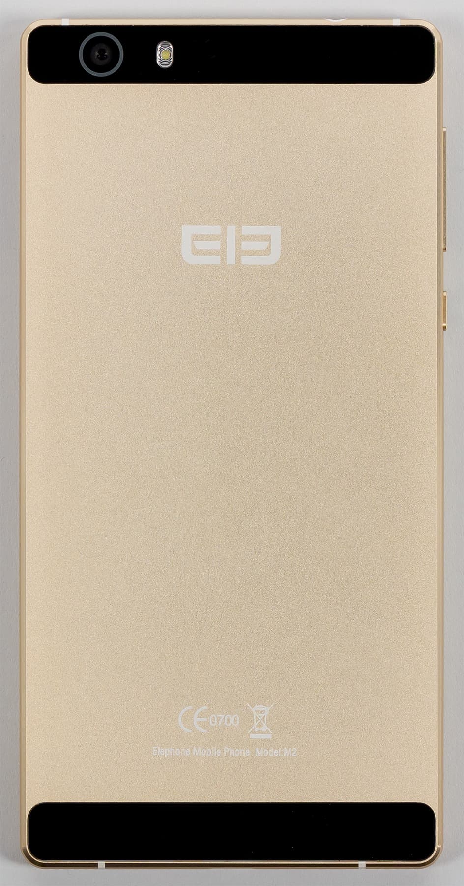 Elephone M2 действительно выглядит впечатляюще: стильный цельнометаллический корпус (металла в корпусе здесь не менее 85%) напоминает одновременно продукты Sony и Huawei имиджевой серии Р, есть здесь что-то и от дизайна НТС. Аппарат получил корпус без плавных изгибов, все линии здесь абсолютно прямые, углы (в плане) закруглены очень мало, как и в аппаратах Sony. Никаких дополнительных ободков нет, корпус цельный, лишь две вставки сверху и снизу на задней панели скрывают под собой антенны и модули связи. На ощупь эти вставки напоминают стекло, хотя это может быть и пластик.