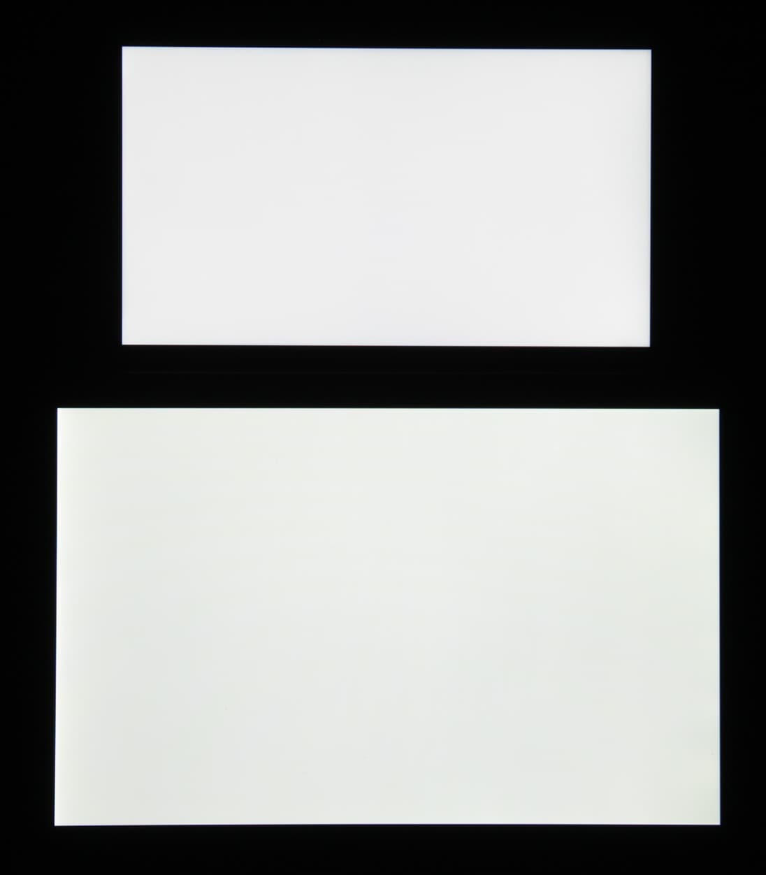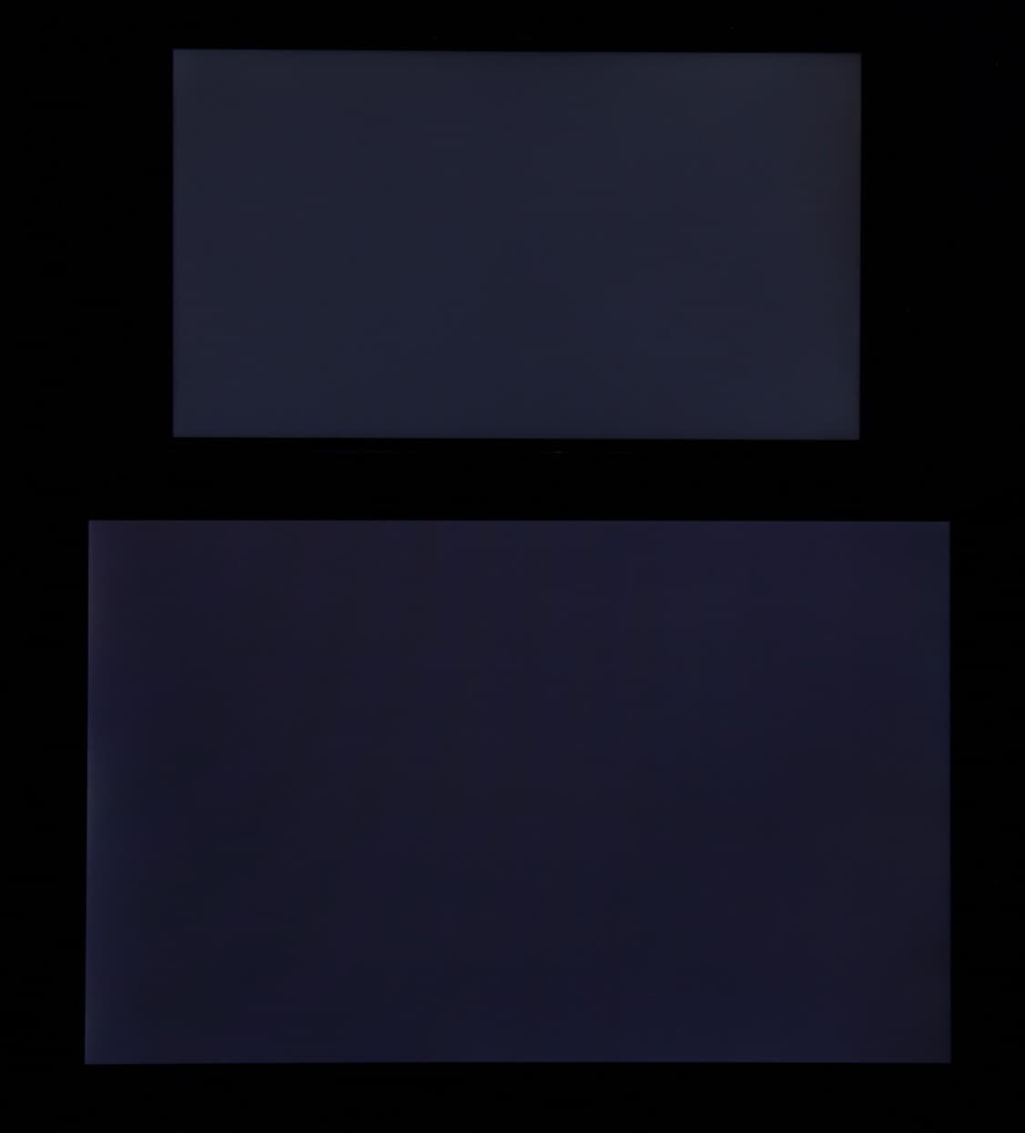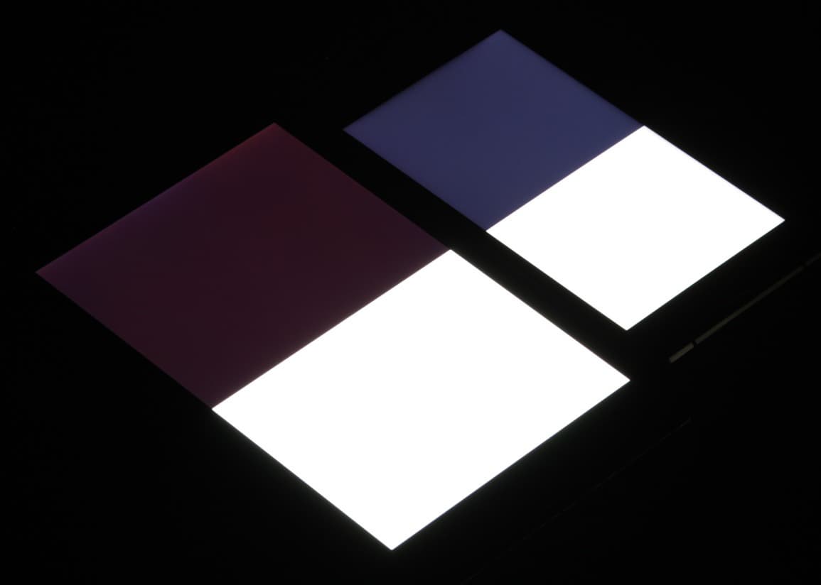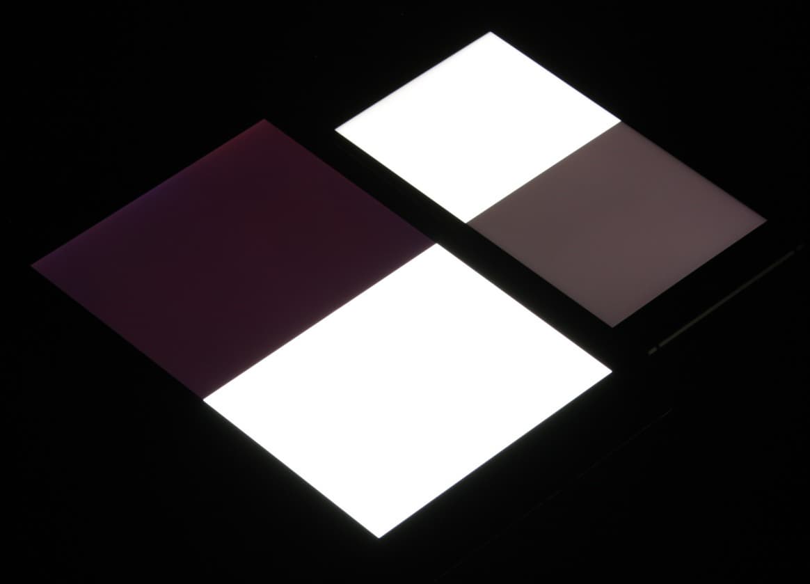 Яркость под углом у экранов уменьшилась (как минимум в 5 раз, исходя из разницы в выдержке), но у Elephone M2 экран заметно темнее. Черное поле при отклонении по диагонали высветляется сильно и приобретает фиолетовый или красноватый оттенок. Фотографии ниже это демонстрируют (яркость белых участков в перпендикулярном плоскости экранов направлении одинаковая!):