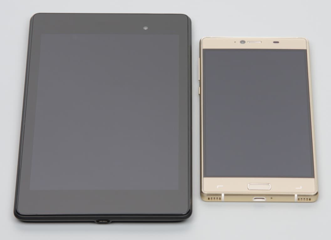Лицевая поверхность экрана выполнена в виде стеклянной пластины с зеркально-гладкой поверхностью, устойчивой к появлению царапин. Судя по отражению объектов антибликовые свойства экрана не хуже, чем у экрана Google Nexus 7 (2013) (далее просто Nexus 7). Для наглядности приведем фотографию, на которой в выключенных экранах отражается белая поверхность (слева — Nexus 7, справа — Elephone M2, далее их можно различать по размеру):