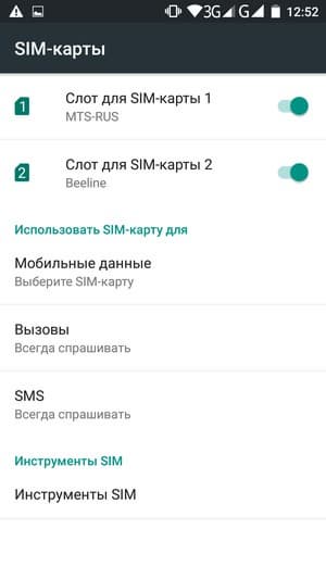 Смартфон поддерживает работу с двумя SIM-картами. Традиционно для интерфейса Android без дополнительных оболочек, настройки, связанные с работой SIM-карт, неудобно разбросаны по нескольким разделам, альтернативные интерфейсы в этом вопросе часто предоставляют гораздо большее удобство управления. Так, в разделе о SIM-картах можно вроде бы настроить всю работу, и все равно не понимать, почему происходит «сбой сети», а потом обнаружить, что необходимо еще зайти в раздел «Траффик данных» и там дополнительно еще раз включить передачу данных, поскольку и там имеется отдельная кнопка, которая по умолчанию выключена. Любую из карт можно изначально назначить основной для голосовой связи, отправки SMS и передачи данных. Если голосовую связь не привязать к определенной карте, то при каждом вызове будет всплывать контекстное меню. Это не очень удобно, лучше было бы иметь перед глазами сразу обе кнопки с обозначенными SIM1 и SIM2 на выбор.