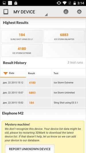 Аккумуляторная батарея, установленная в Elephone М2, имеет небольшую для современных смартфонов емкость всего в 2600 мА·ч. Соответственно, огромный экран с высоким разрешением и требовательная аппаратная платформа (по всей видимости, плохо оптимизированная) заставили героя обзора продемонстрировать чрезвычайно слабый уровень автономности. Платформы MediaTek никогда не славились особой экономичностью, но в случае с Elephone M2 положение дел можно назвать катастрофическим.