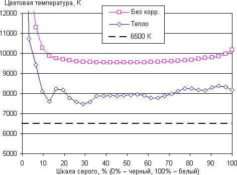 В итоге цвета имеют естественную насыщенность. Баланс оттенков на шкале серого слегка компромиссный, так как цветовая температура сильно выше стандартных 6500 К, но отклонение от спектра абсолютно черного тела (ΔE) все же меньше 10, что для потребительского устройства считается приемлемым показателем. При этом цветовая температура и ΔE мало изменяются от оттенка к оттенку — это положительно сказывается на визуальной оценке цветового баланса. (Самые темные области шкалы серого можно не учитывать, так как там баланс цветов не имеет большого значения, да и погрешность измерений цветовых характеристик на низкой яркости большая.)