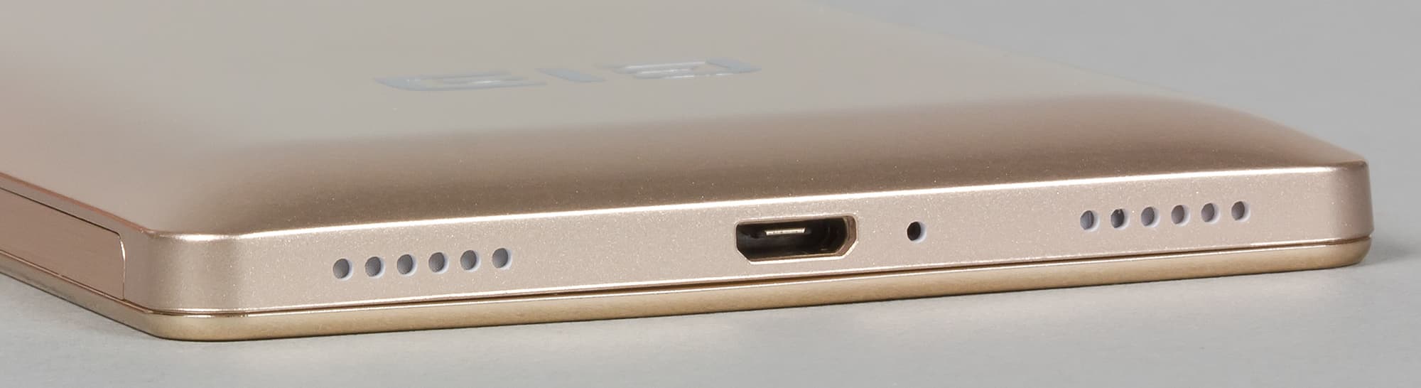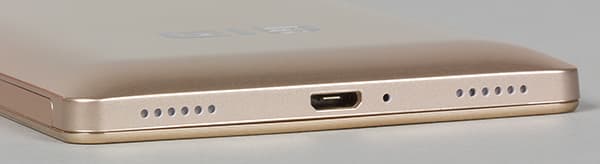 Остальные элементы разместились более привычно. Решетка динамика, вырезанная прямо в металле корпуса в виде двух симметричных блоков, установлена в нижнем торце. И как обычно, лишь одна половина служит для выхода реального звука, а вторая — просто бутафория. Между решетками посередине врезаны разъем Micro-USB, поддерживающий OTG, и отверстие основного микрофона.