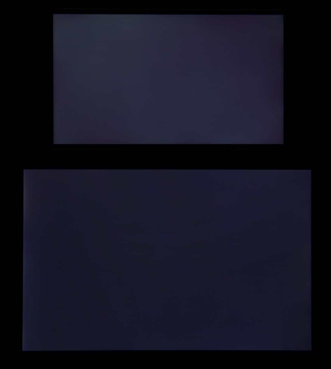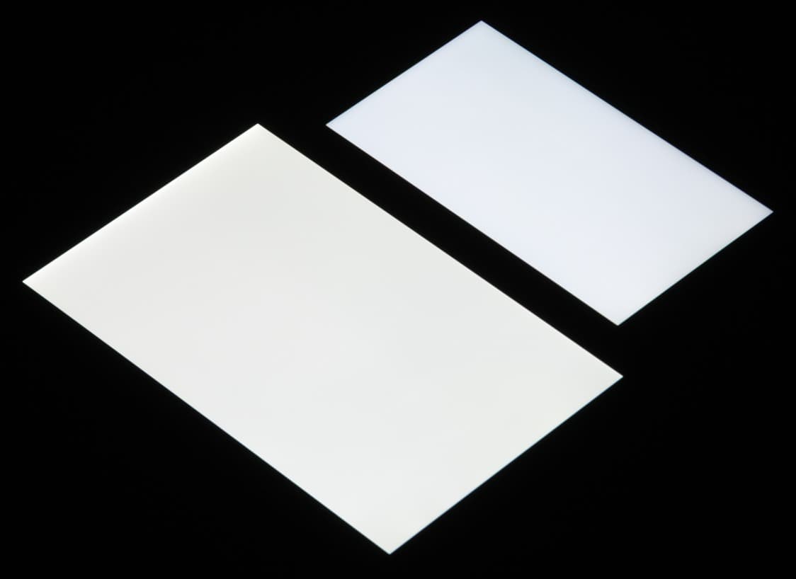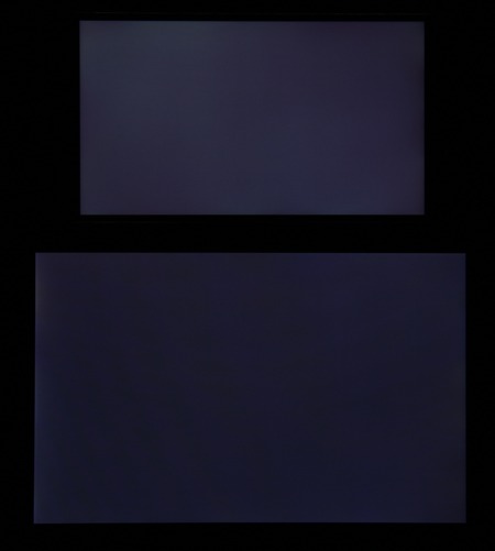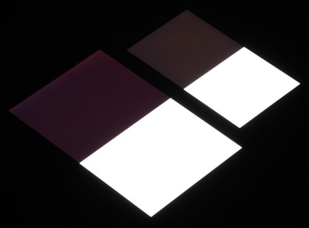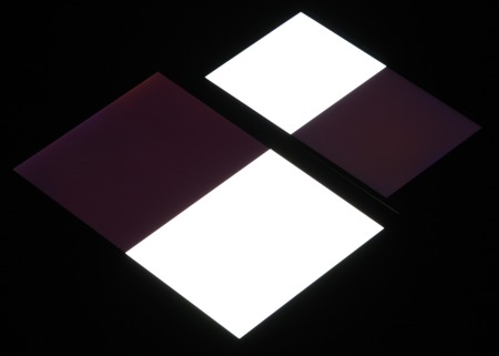 Яркость под углом у обоих экранов уменьшилась примерно одинаково. Черное поле при отклонении по диагонали высветляется слабо и приобретает легкий красноватый оттенок. Фотографии ниже это демонстрируют (яркость белых участков в перпендикулярном плоскости экранов направлении одинаковая!):