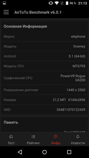 Аппаратная платформа Elephone Vowney строится на базе флагманской на текущий момент серийной SoC MediaTek MT6795. Причем здесь используется упрощенная её модификация с частотой процессорных ядер 1,85 ГГц, в то время, как обычная версия обладает частотой ядер до 2.0 ГГц, а у разогнанной модификации MT6795T «Тurbo» так и вовсе частота ядер CPU увеличена до 2,2 ГГц. Данная 64-битная платформа, которую еще называют Helio X10, выполнена по техпроцессу 28 нм, в ее состав входят восемь 64-битных ядер ARM Cortex-A53. Объем ОЗУ составляет более чем достойные 4 ГБ, а общий массив встроенной памяти имеет объем 32 ГБ, из которых около 25,5 ГБ доступно пользователю. Также смартфон поддерживает подключение карт памяти microSD и внешних запоминающих устройств по OTG, то есть с количеством свободной памяти у героя обзора проблем не должно быть. Карточки поддерживаются объемом до 128 ГБ, на практике наша проверочная карта Transcend Premium microSDXC UHS-1 объемом 128 ГБ уверенно распозналась устройством.