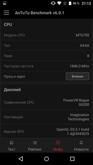 - SoC MediaTek MT6795 (Helio X10), 1,85 ГГц, 8 ядер ARM Cortex-A53