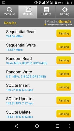 Результаты теста AndroBench на скорость работы с памятью: