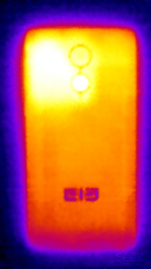 Ниже приведен теплоснимок задней поверхности, полученный после 10 минут работы теста аккумулятора в программе GFXBenchmark (ближе к белому — выше температура):