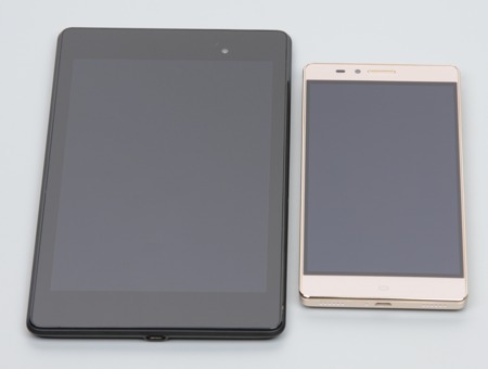 Лицевая поверхность экрана выполнена в виде стеклянной пластины с зеркально-гладкой поверхностью, устойчивой к появлению царапин. Судя по отражению объектов антибликовые свойства экрана не хуже, чем у экрана Google Nexus 7 (2013) (далее просто Nexus 7). Для наглядности приведем фотографию, на которой в выключенных экранах отражается белая поверхность (слева — Nexus 7, справа — Elephone Vowney, далее их можно различать по размеру):