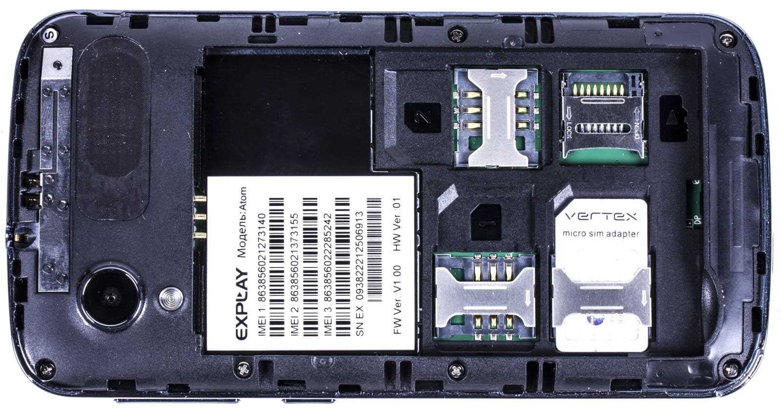 Все четыре разъема смартфона теснятся под аккумулятором — три Mini-SIM и один microSD. Если использовать переходник для SIM-карты, то без подручных инструментов ее не извлечь, поэтому мы рекомендуем устанавливать именно карты Mini-SIM. Для удобства ориентирования в Android все слоты пронумерованы.
