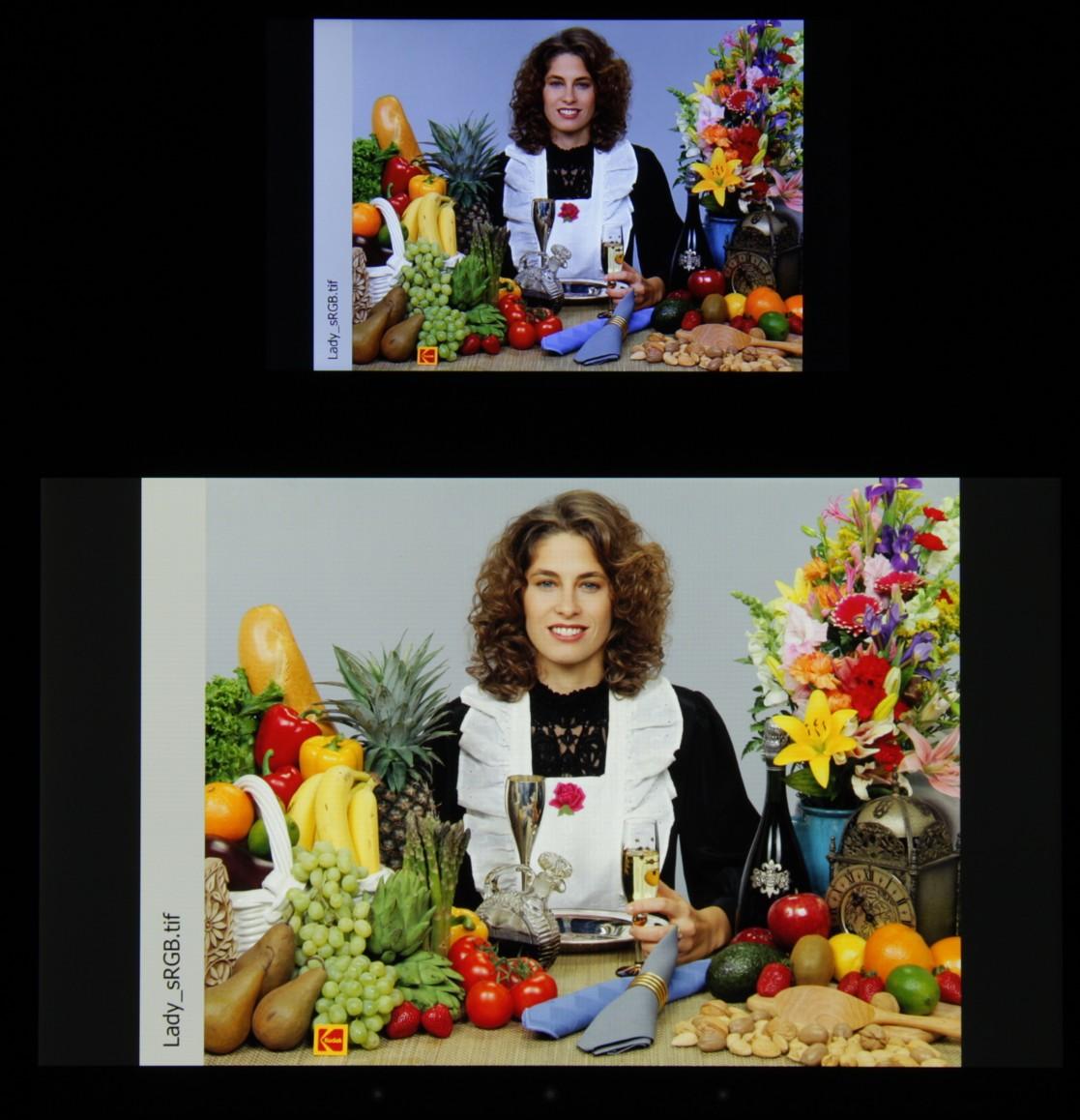 Данный прием позволяет увеличить яркость экрана при тех же затратах энергии на подсветку, но цвета теряют в насыщенности (в данном случае незначительно). Баланса оттенков на шкале серого как такового нет вообще - цветовая температура выше стандартных 6500 К и сильно меняется от оттенка к оттенку: