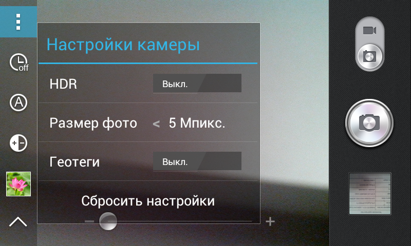 Программа управления камерой имеет простой и незамысловатый интерфейс. Словно намекая на сугубо утилитарное предназначение камеры в данном смартфоне, настроек съемки не очень много, есть лишь самое необходимое: таймер, режим съемки, геотеги, коррекция экспозиции, HDR и различные эффекты съемки (уже не столь актуальные в эпоху Instagram).