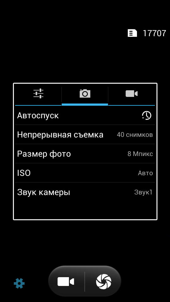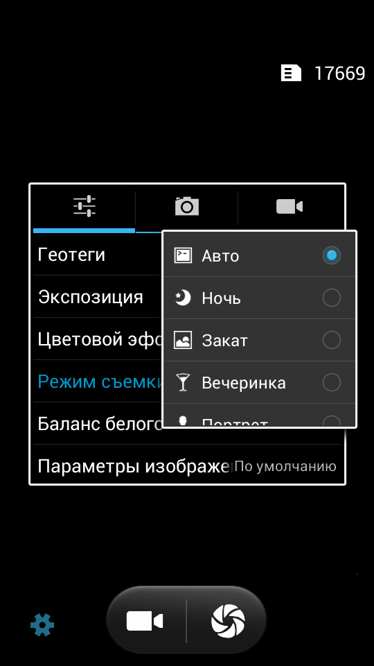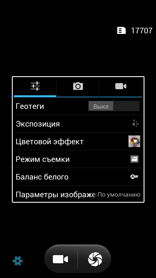 Полный набор настроек доступен только в обычном режиме съемки. Из общих параметров упомянем поддержку геотегов, коррекцию экспозиции, установку баланса белого, выбор сцены и цветового эффекта. Для фотографий доступны таймер спуска, непрерывная съемка, размер фотографий, установка ISO, отключения звука камеры. У видео опций меньше — качество, отключение микрофона, замедление (интервальная съемка). Отметим, что во время непрерывной фотосъемки и видеосъемки работа автофокуса может быть не очень хорошей, если есть недостаток освещения. Проверка в Skype показала, что обе камеры дают темную картинку при работе в комнатных условиях и среднем освещении.