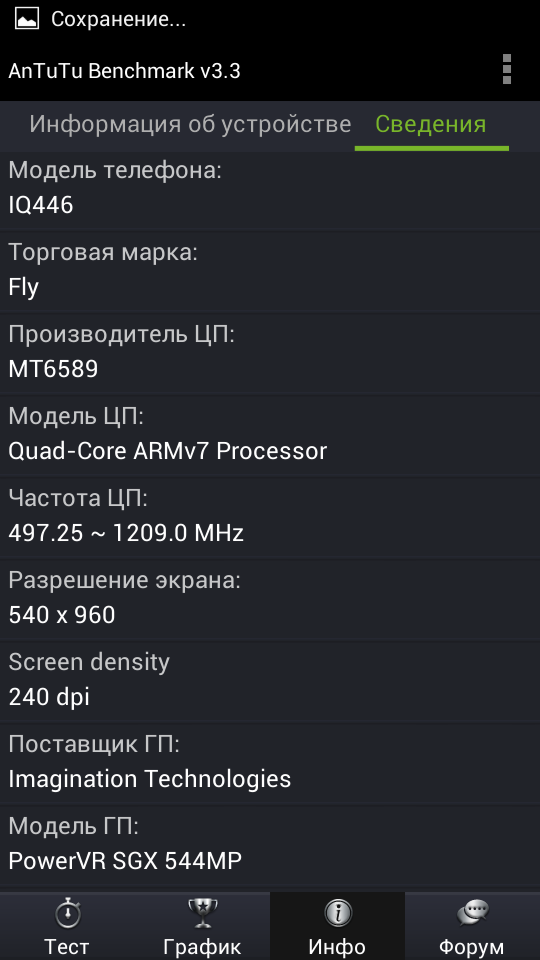 Это уже не первое устройство на четырехъядерной платформе Mediatek MT6589 в нашей лаборатории. В прошлых обзорах мы уже говорили о том, что в настоящий момент не очень понятно, зачем могут потребоваться именно четыре (процессорных) ядра в смартфоне. Кроме того, с точки зрения энергопотребления они могут быть более требовательными. Впрочем, в этом вопросе многое зависит как от особенностей аппаратной реализации (в частности минимальной частоте работы), так и настройки программного обеспечения. В данном случае у нас есть четыре ядра ARMv7, которые работают на частоте от 500 МГц до 1,2 ГГц (а всего есть четыре состояния). Никаких дополнительных опций энергосбережения, влияющих на работу процессора в устройстве нет. Напомним, что графическая часть представлена известным одноядерным решением PowerVR SGX544, который обслуживает экран относительно невысокого разрешения, а объем оперативной памяти составляет 1 ГБ.