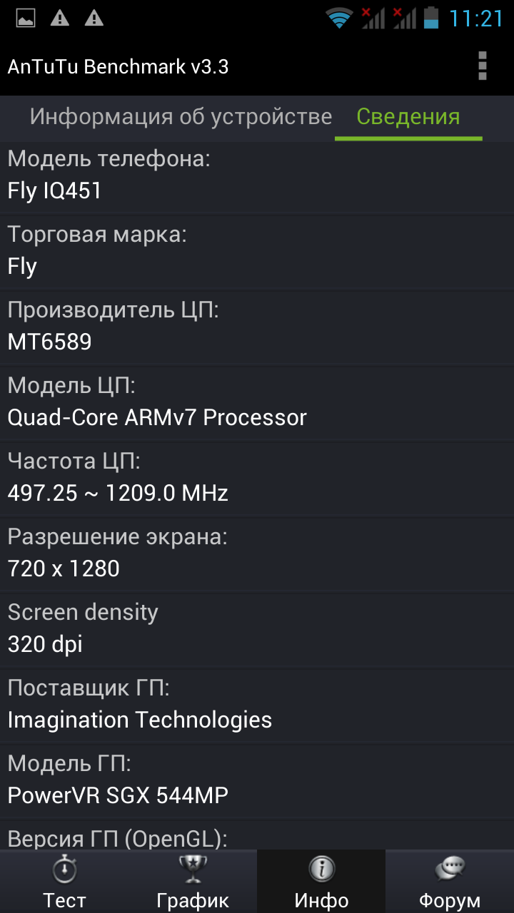Все прочие программы для тестирования производительности должным образом оценили как наличие четырех ядер, так и мощь графического процессора. Смартфон Fly IQ451, а вместе с ним и платформа MT6589, заняли соответствующее им место в табели о рангах, значительно опередив соперников на основе куда менее мощных SoC. В некоторых тестах преимущество новинки оказалось двукратным.