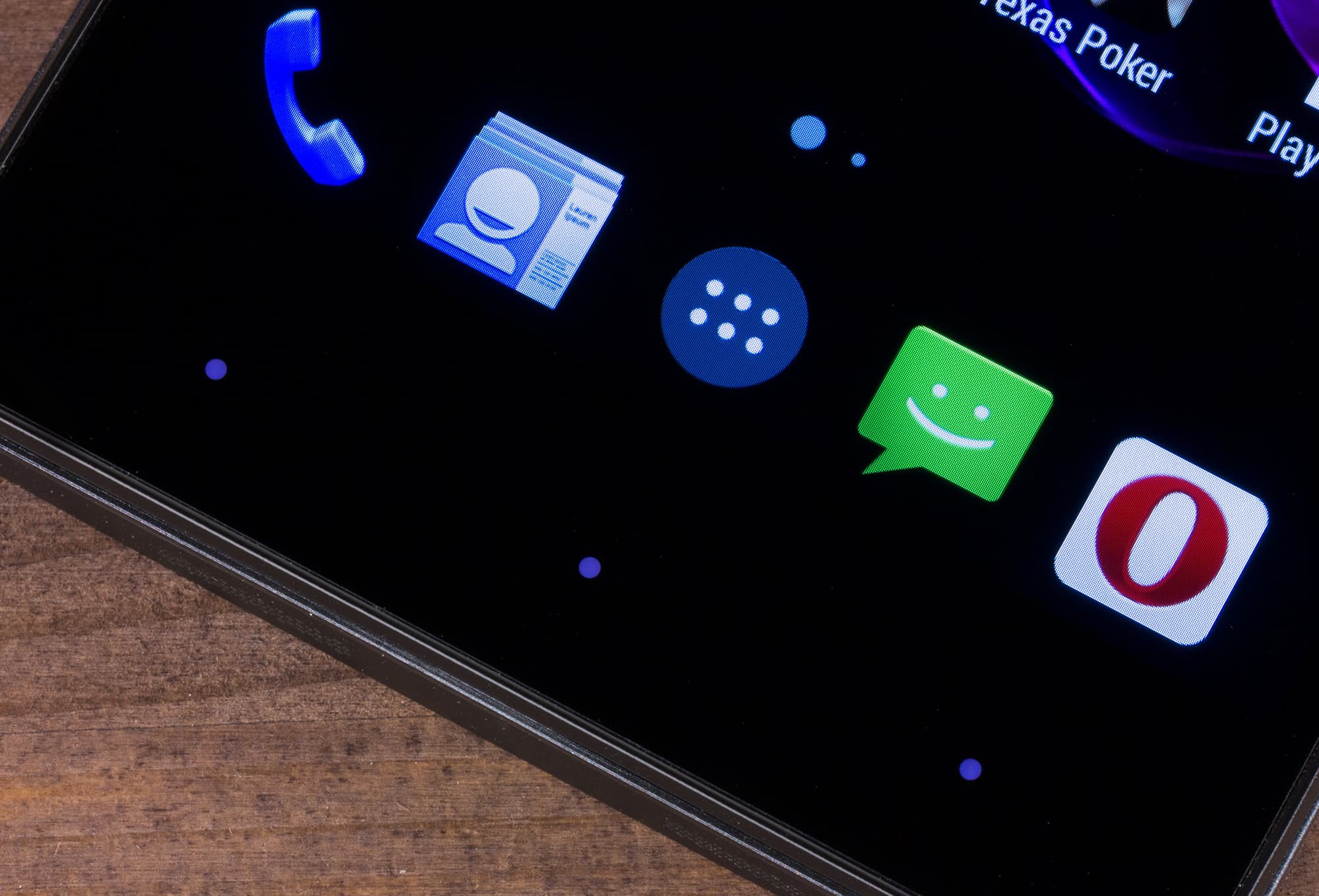 Ниже, под экраном, располагается не совсем привычный ряд из трех аппаратных кнопок управления системой и приложениями. Хотя все эти кнопки сенсорные, на них не нанесены отличительные пиктограммы — только три одинаковых светящихся круглых точки обозначают места расположения данных элементов на корпусе. Назначение же каждой из кнопок придется запоминать по памяти. Кнопки имеют достаточно яркую подсветку белого цвета, повлиять как-либо на длительность и интенсивность работы подсветки с помощью настроек нельзя.
