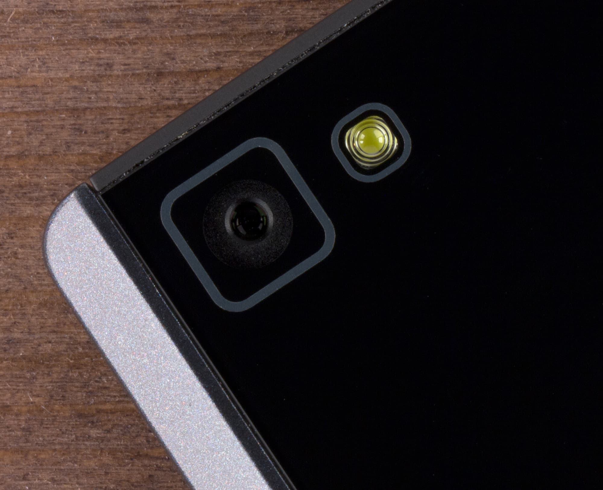 На тыльной поверхности смартфона под стеклом разместились квадратное окошко камеры и такой же квадратный глазок одиночной светодиодной вспышки (штатной программы-фонарика для нее в смартфоне не обнаружилось). Данные элементы не выделяются на общем фоне, потому что целиком спрятаны под общей поверхностью защитного стекла, прикрывающего целиком всю тыльную сторону аппарата.