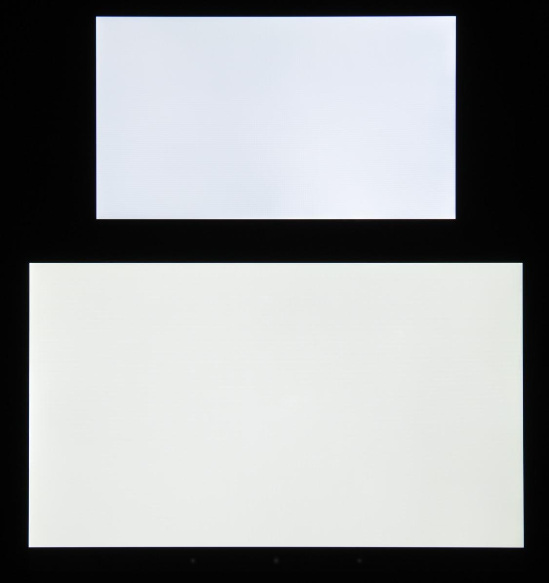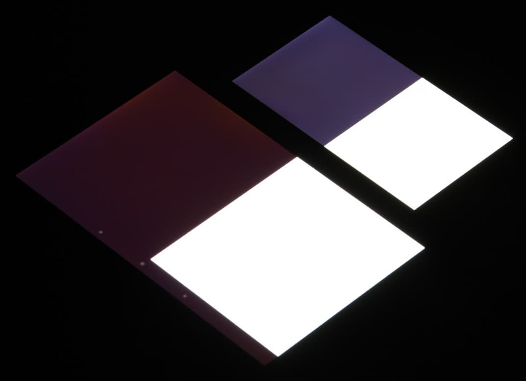 Яркость под углом у экранов уменьшилась (как минимум в 5 раз, исходя из разницы в выдержке), но в случае Fly Tornado One падение яркости больше. Черное поле при отклонении по диагонали высветляется сильно и приобретает фиолетовый или красно-фиолетовый оттенок. Фотографии ниже это демонстрируют (яркость белых участков в перпендикулярном плоскости экранов направлении примерно одинаковая!):