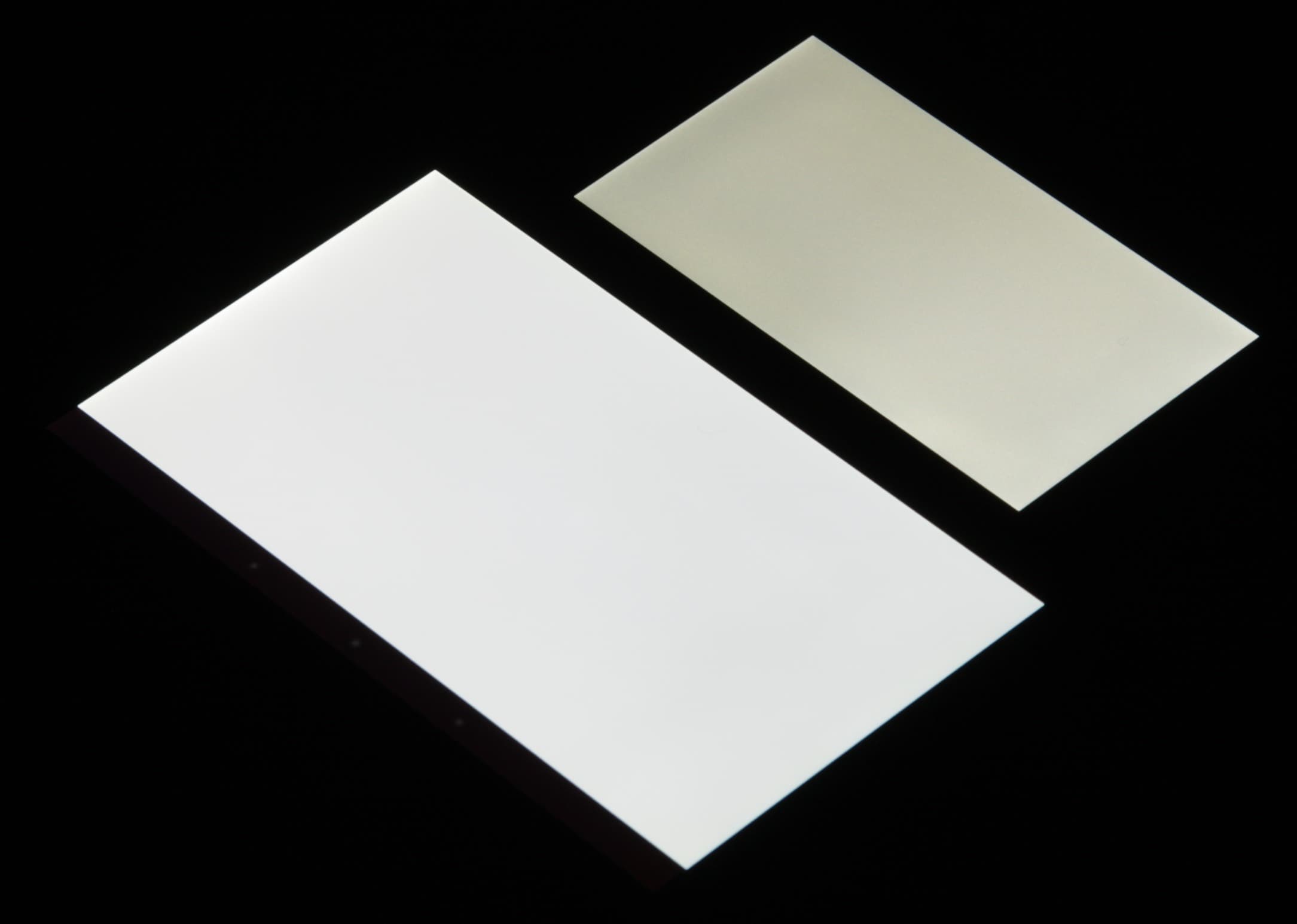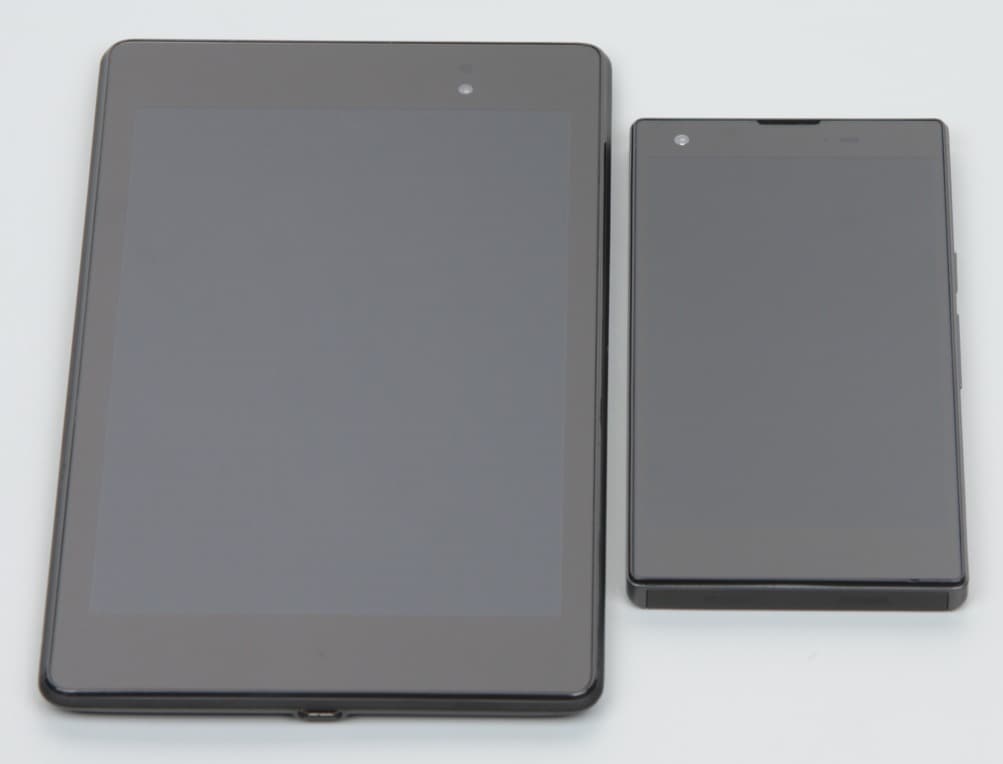 Лицевая поверхность экрана выполнена в виде стеклянной пластины с зеркально-гладкой поверхностью, устойчивой к появлению царапин. Судя по отражению объектов антибликовые свойства экрана чуть лучше, чем у экрана Google Nexus 7 (2013) (далее просто Nexus 7). Для наглядности приведем фотографию, на которой в выключенных экранах отражается белая поверхность (слева — Nexus 7, справа — Fly Tornado One, далее их можно различать по размеру):