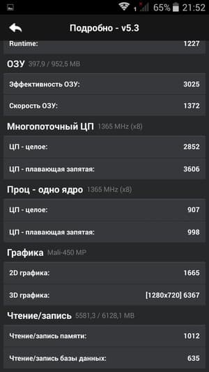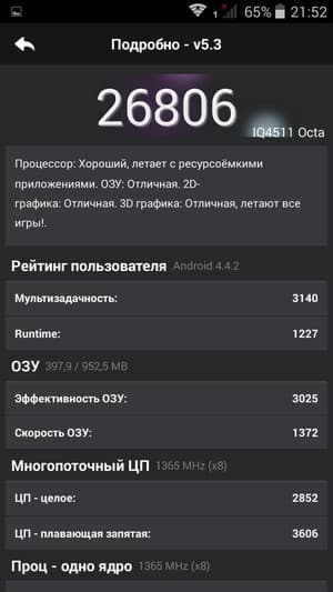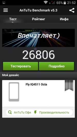 Результаты тестирования ожидаемо показали, что производительность у смартфона находится приблизительно на среднем уровне (примерно 27К в AnTuTu v 5.x). Также вполне ожидаемо, что урезанная модификация платформы закономерно оказалась немного медленнее, чем полноценная версия MT6592 с частотой процессорных ядер 1,7 ГГц (примерно 30К в AnTuTu на примере Fly Tornado Slim и Micromax Canvas Nitro). Добавить здесь особенно нечего, восьмиядерная SoC MediaTek MT6592 уже давно и прочно обосновалась на рынке, она хорошо уже нами изучена на примере множества аппаратов, протестированных за прошедший год. Рекордов по производительности она никогда не била и уже не побьет, но и смартфоны на ее основе не слишком дороги. На смену ей постепенно будет приходить новая MT6595, некоторые из таких устройств мы уже исследовали. Новая платформа превосходит свою предшественницу столь значительно, что сравнивать их просто бессмысленно. Удел SoC MediaTek MT6592 — средний и дальше по нисходящей уровни, но никак не топовый и не флагманский. Тем не менее, описываемый сегодня смартфон достаточно мощный, производительности восьмиядерной платформы еще долго будет хватать для выполнения большинства задач, в том числе и для требовательных игр.