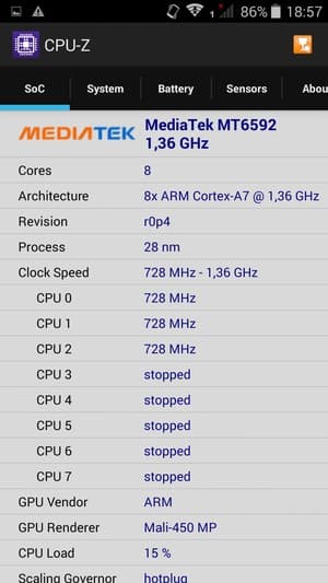 - SoC MediaTek MT6592m, 1,4 ГГц, 8 ядер, ARM Cortex-A7