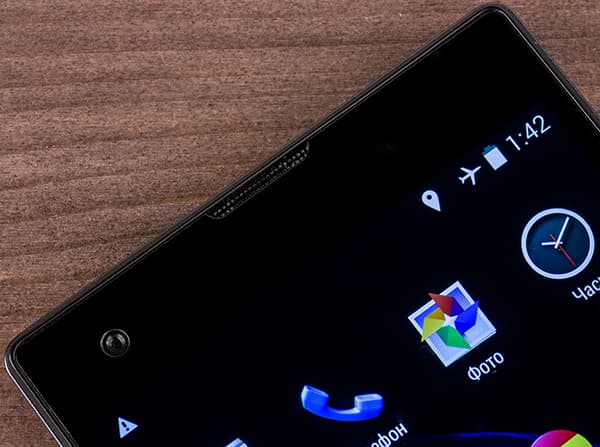 Передняя панель также полностью прикрыта плоским тонированным защитным стеклом. В верхней части в стекле вырезана выемка для размещения решетки телефонного динамика, рядом с ней виднеются сенсоры и окошко фронтальной камеры. Также здесь присутствует такой полезный элемент, как светодиодный индикатор оповещений: он светит круглой точкой, сигнализируя о статусе зарядки.