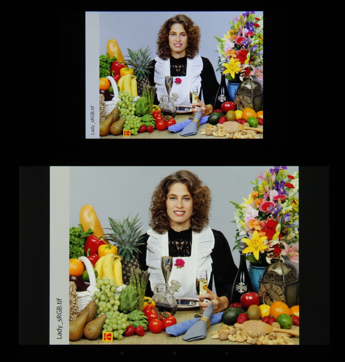 В итоге визуально цвета имеют естественную насыщенность. Баланс оттенков на шкале серого посредственный, так как цветовая температура слишком высокая. Правда, отклонение от спектра абсолютно черного тела (ΔE) меньше 10, что для потребительского устройства считается хорошим показателем. При этом цветовая температура и ΔE несильно изменяются от оттенка к оттенку — это положительно сказывается на визуальной оценке цветового баланса. (Самые темные области шкалы серого можно не учитывать, так как там баланс цветов не имеет большого значения, да и погрешность измерений цветовых характеристик на низкой яркости большая.)