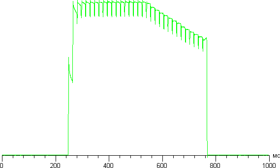 Только на низком уровне яркости присутствует модуляция с частотой 247 Гц (да, именно 247). На рисунке ниже приведены зависимости яркости (вертикальная ось) от времени (горизонтальная ось) для нескольких значений яркости: