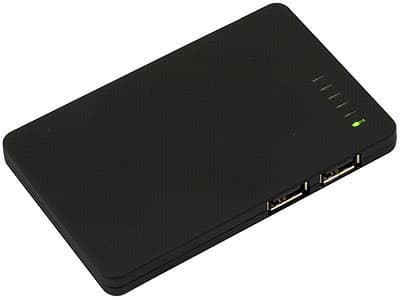Параллелепипед из приятной на ощупь пластмассы имеет размеры 102 х 65 х 9,5 мм. На лицевой поверхности можно обнаружить шесть светодиодов, на одном из длинных торцов — два USB-порта, на коротком — кнопку, включающую подачу питания на них (судя по всему такой механизм применен потому, что USB-розетки А-типа имеют достаточно большие размеры, что может привести к попаданию туда мусора, короткому замыканию и быстрому разряду встроенного аккумулятора вследствие этого), а снизу можно найти короткий USB-кабель, служащий для подключения устройства к компьютеру, либо другому источнику тока с соответствующей розеткой. Все, что требуется от последнего — обеспечивать подачу тока, напряжением 5 В и силой 0,5 А, т.е. в точности по спецификациям USB. Соответственно, подключаем к источнику тока — заряжаем встроенный Li-Pol аккумулятор емкостью 2200 мАч и напряжением 3,7 В судя по всему (на корпусе указана и емкость в Втч — 8,14), контролируя процесс зарядки по пяти красным светодиодам на лицевой поверхности. Зарядили — кладем в карман/сумку или еще куда-нибудь и отправляемся в места нецивилизованные безрозеточные. Понадобилось нам в них зарядить какое-нибудь устройство — подключаем его кабель к одному из выходных портов, нажимаем кнопку (после чего загорается зеленый светодиод, символизируя подачу напряжения) и процесс идет. Одной «порции» заряда достаточно, например, чтобы полностью зарядить аккумулятор коммуникатора HTC Max 4G или ему подобного устройства, имеющий емкость 1,5 Ач, а для какого-нибудь мобильного телефона этого количества энергии достаточно и на две полных зарядки.