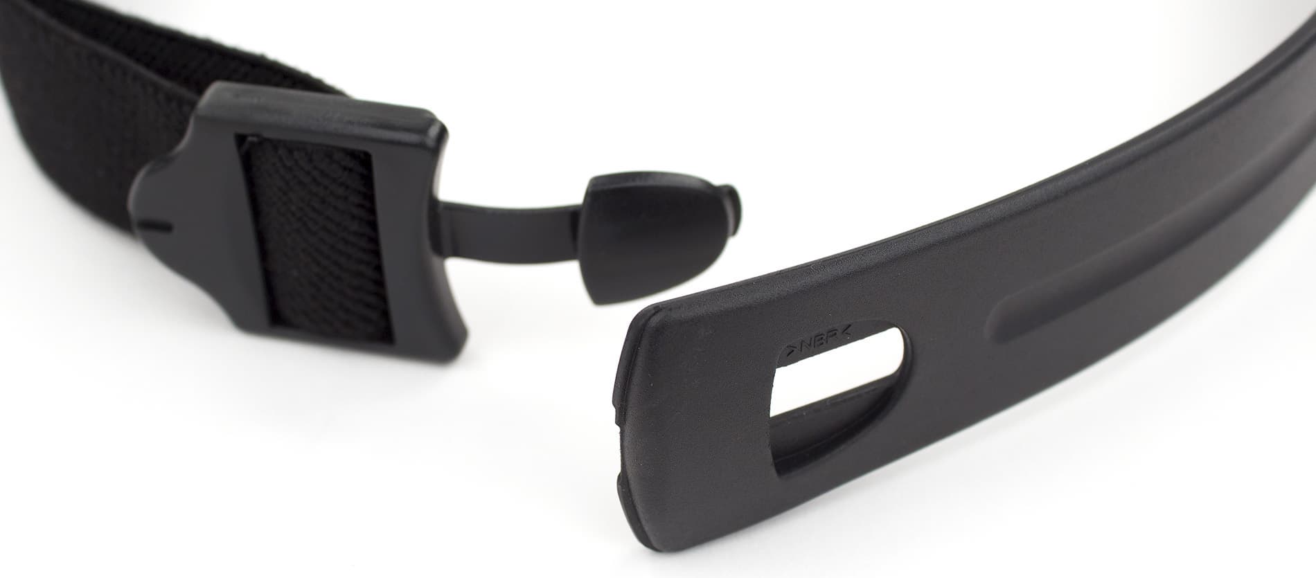 Пульсометр состоит из нескольких частей. Это основной блок, выполненный из пластика, примыкающие к нему с обеих сторон резиновые ремни с контактными зонами, а такжде тканевый ремень (с растягиваемой резинкой внутри и возможностью регулировки длины), на конце которого — пластиковая застежка.