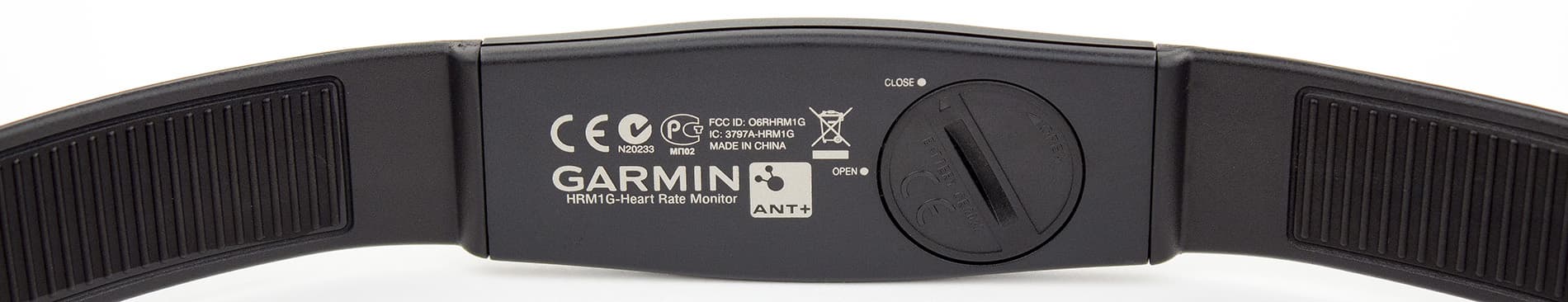 На внутренней стороне основного блока мы видим батарейный отсек, закрытый пластиковой крышкой. Пульсометр работает на стандартной батарее-таблетке CR2032. Для доступа к ней надо вставить в прорезь на крышке монету и повернуть против часовой стрелки.